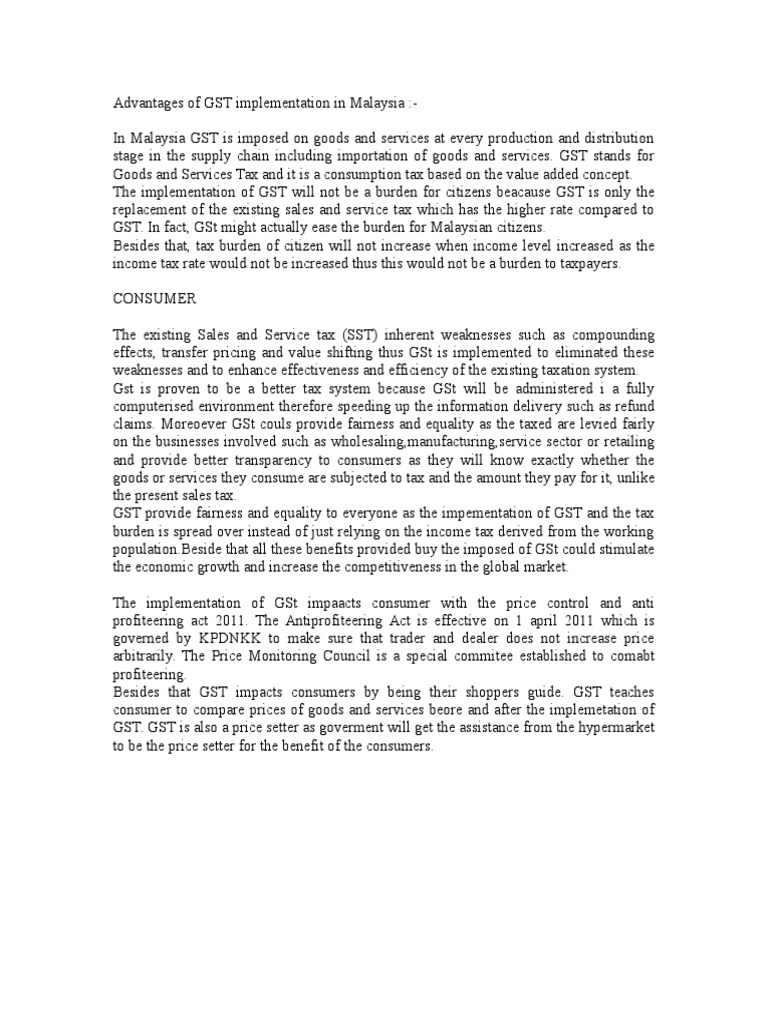 Advantages of gst goods and service tax (gst) is a good tax system that has been applied in malaysia and some country.