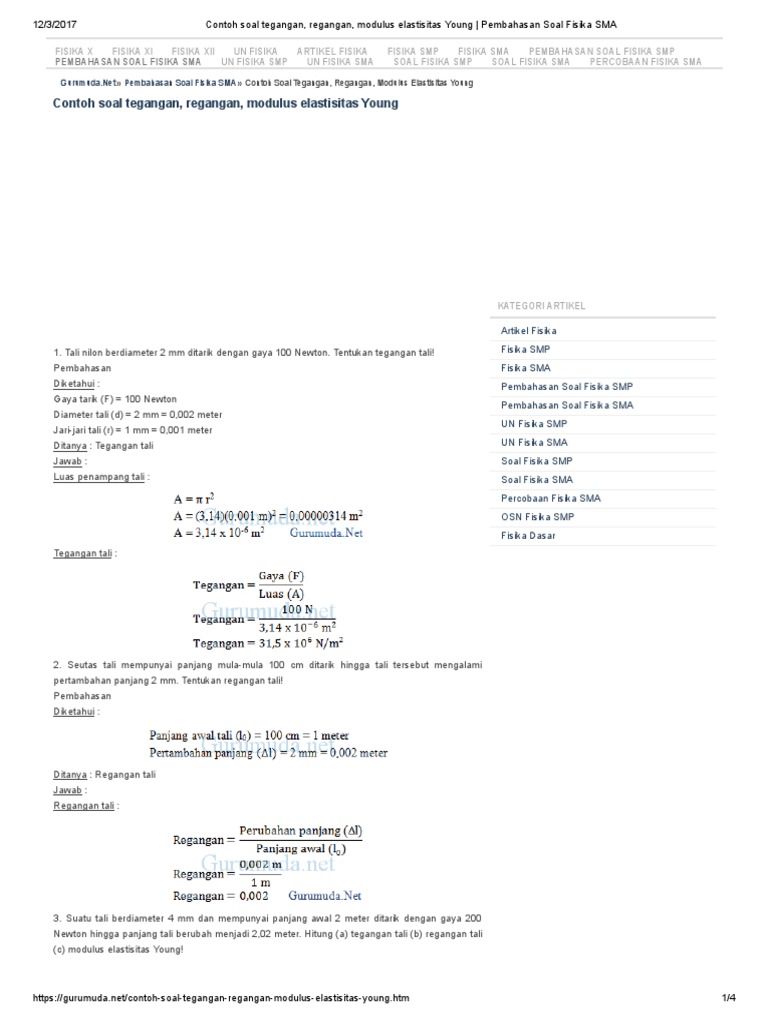 Contoh Soal Dan Jawaban Tegangan Regangan Dan Modulus ... from online.fliphtml5.com Perbandingan antara tegangan dan regangan benda tersebut disebut modulus elastisitas atau modulus young. Sobat punya sebuah kawat dengan luas. Tentukan nilai modulus young sebuah tali. Materi fisika kita kali ini akan membahas tentang salah satu besaran dalam elastisitas, yaitu modulus elastisitas atau modulus young. Contoh soal+jawaban tegangan,regangan dan modulus elastisitas. Nah dalam hal dengan istilah lain, modulus young adalah suatu bentuk perbandingan yang terjadi diantara tegangan dan regangan pada suatu benda. Gurumuda.net pembahasan soal fisika sma contoh soal tegangan, regangan, modulus elastisitas young. Gunakan g = 10 m/s2.